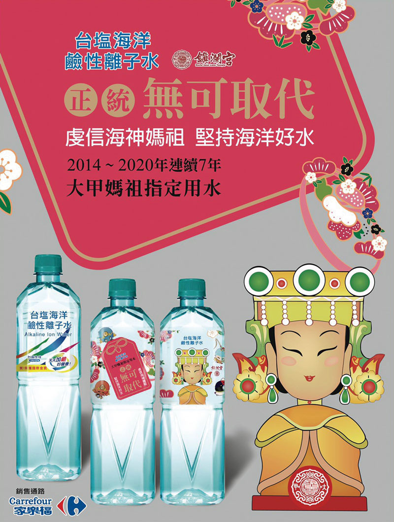 大甲媽祖授權祈福瓶,在祈福現場舉辦過爐儀式,承載媽祖的庇佑,今年3月在家樂福等通路限量推出,百萬瓶不到兩個月就熱銷完售。