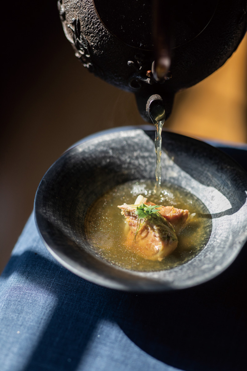 樂埔町主廚用茅乃舍產品設計一整套的菜單,圖為餐宴上以茅乃舍蔬菜高湯包與鴨肝等食材做成的湯品。