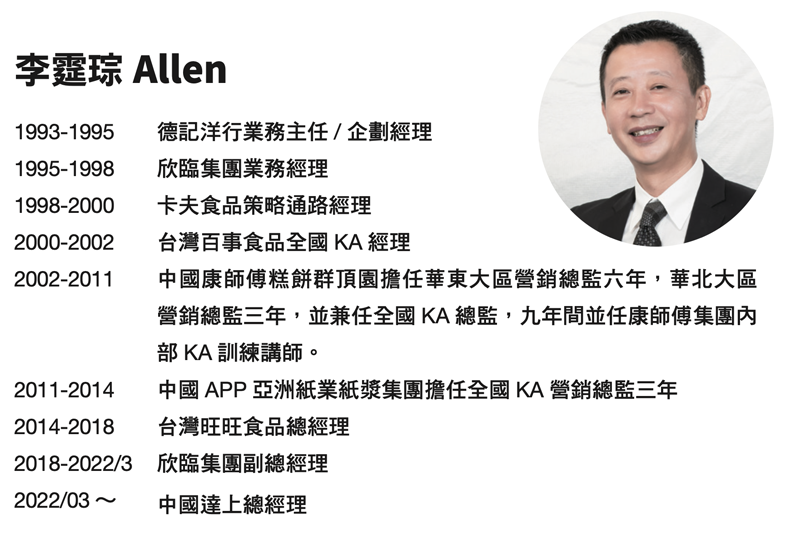 Allen 總經理在 FMCG 產業擁有 30 年豐富資 歷,對於中國消費市場擁有最專業的觀察及豐富營 運經驗。Allen 表示,疫情讓環境產生變化,達上 也趁此自我檢視,對風險管理進行評估,並積極做 應對與調整。