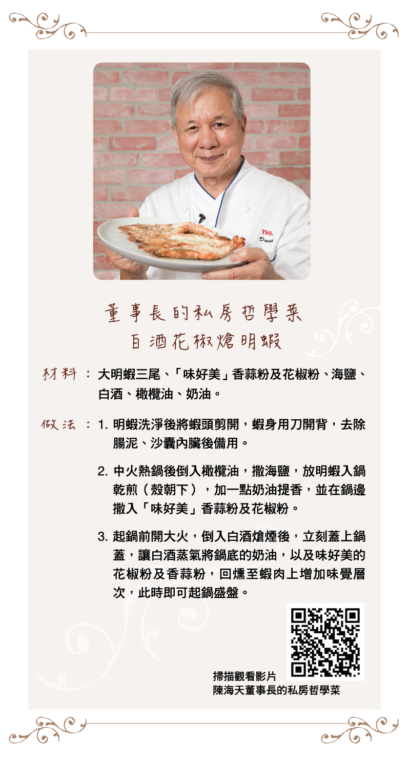 欣臨今年邁入第46年,帶著同仁打拚近半世紀的陳海天董事長,帶我們走進欣臨Food Service 廚房,卸下老董威嚴,換上廚師服,化身為Chef David,用欣臨代理的餐飲品牌「味好美」優質產品,分享料理秘訣與企業用人哲學。