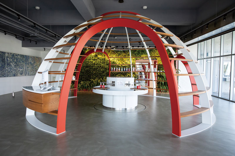 走進位於美琪生技新屋廠,接待大廳後側是一面充滿綠意的植栽牆,中間挑高大廳則規劃了一座造型富麗的環狀洗手台,引導大家用洗手乳洗手、烘乾,提醒大家隨時保持潔淨的衛生習慣,充分展現了這個1943年成立、從香藥皂起家的老品牌的精神。
