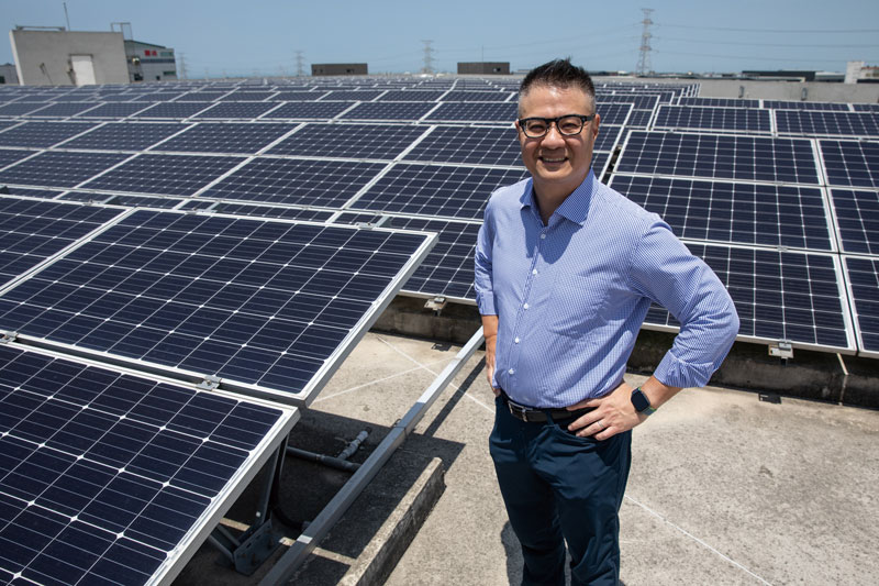 過去嬌生代理沙威隆的時候,生產地是在馬來西亞,如今生產地改為台灣在地製造,而且是在堪稱業界模範工廠的美琪生技桃園新屋工廠。走上新屋工廠的五樓頂樓,裝設了一片一片的太陽板,「一年可以發約30萬度電,大約供應工廠一半用電量。」吳英偉介紹,而在一樓還有近期才建設好的生態池,這些都可以看出美琪生技新屋工廠的環保理念。